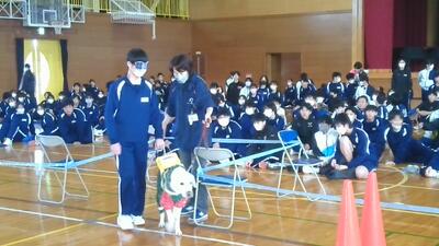 視覚障がい者の方の気持ちに寄り添った考え方や白杖などの道具への正しい理解の説明を含むご講話を頂き、最後にはアイマスクを付けて盲導犬との歩行体験の機会をいただきました。各クラス1人、計10人の生徒が真剣に取り組んでいました。社会には様々な人が共生していること、また思いやりのある行動の大切さを改めて感じることができたとても有意義な時間となりました。ありがとうございました。