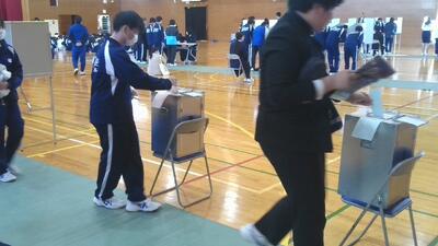 校長先生からの講評の後、選挙管理委員より「投票上の注意」についての説明がありました。体育館後方に設けられた投票場では、受付で整理券を渡し、記載台で投票用紙に記入した後、投票箱に投票用紙を入れるという流れで投票が行われました。