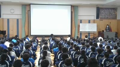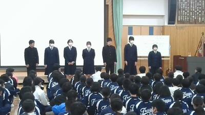また、2学期の始業式で生徒に伝えた「お願い」についても改めて振り返りがありました。1年生には「先輩になる準備を進めること」「ふわふわ言葉を使って生活すること」、2年生には「中学校の中心として学校を引っ張る準備をすること」、3年生には「進路決定に向けて努力を続けること」について話があり、全校生徒がそれぞれの立場で成長してきたことが伝えられました。そして、充実した冬休みを過ごしてほしいという言葉で締めくくられました。