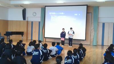 11月27日(木)の6時間目、2年生が多目的ホールにて「立志記念スキー宿泊学習に向けた学年集会」を行いました。集会では、実行委員の皆さんが、今回の宿泊学習に向けた思いや目標、そして今後の取り組みについて発表しました。
